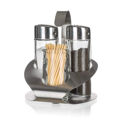 Súprava soľnička a korenička CULINARIA 35 ml, 4 ks. Veko: nerez 18/8 a plast PP a silikónové tesnenie, hrúbka nerezy 0,40 mm, dózy: sklo, stojan nerez 18/0, základňa: 0,60 mm, držadlo 0,80mm.