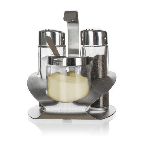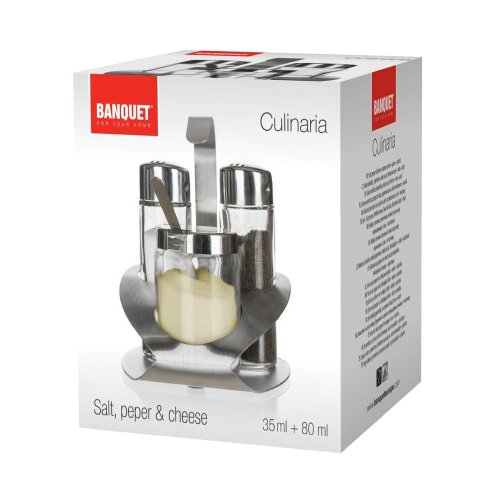 Sada soľnička, korenička, dóza na syr CULINARIA 4 ks. Veko: nerez 18/8 a plast PP a silikónové tesnenie, hrúbka nerezu 0,40 mm, dózy: sklo, stojan nerez 18/0, základňa: 0,60 mm, držadlo 0,80 mm.