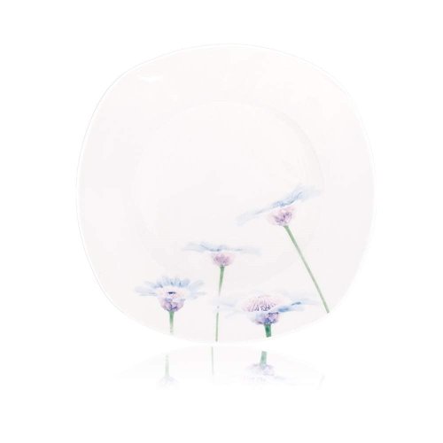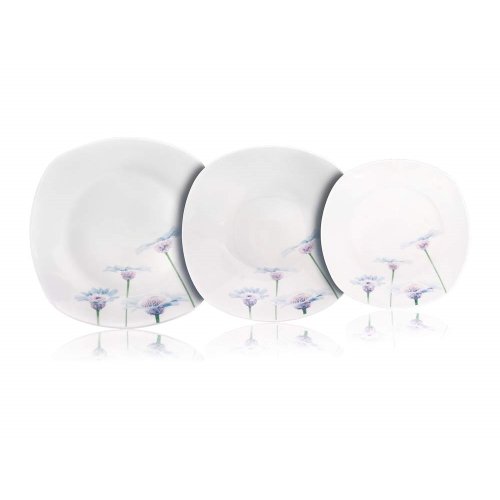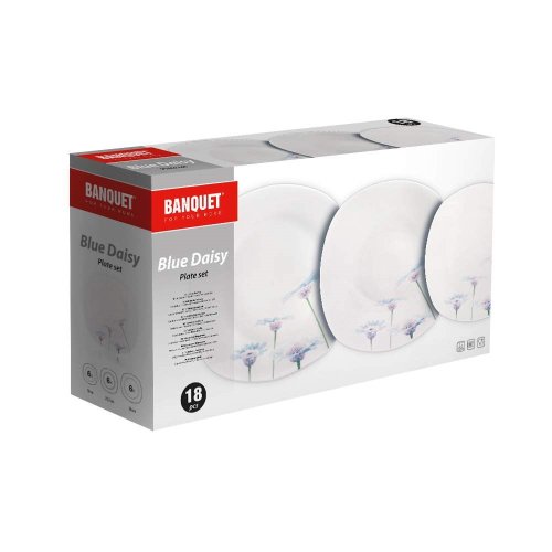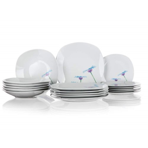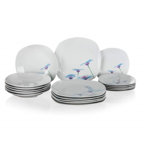 18dielna tanierová sada square v bielej farbe s dekorom BLUE DAISY je vyrobená z porcelánu, vhodná na servírovanie rôznych pokrmov. Sada obsahuje: 6 x dezertný tanier (diagonála 20 cm, šírka 18,5 cm), 6 x hlboký tanier (diagonála 23 cm, šírka 22 cm) a 6 x plytký tanier (diagonála 27 cm, šírka 25 cm). Taniere je možné používať do mikrovlnnej rúry a umývať v umývačke riadu.