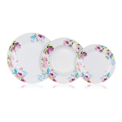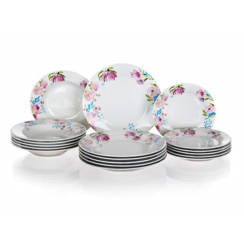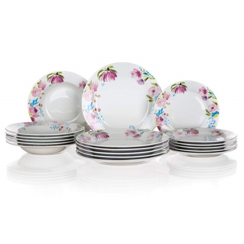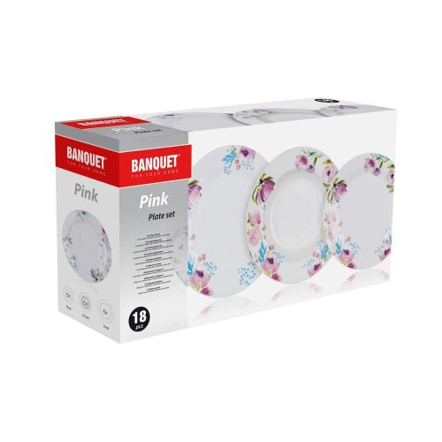 18dielna tanierová sada PINK FLOWERS je vyrobená z porcelánu. Sada obsahuje: 6x dezertný tanier 19 cm, 6x hlboký tanier 21,5 cm a 6x plytký tanier 24 cm. Taniere je možné používať do mikrovlnnej rúry a umývať v umývačke riadu.