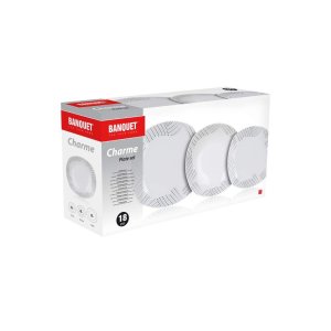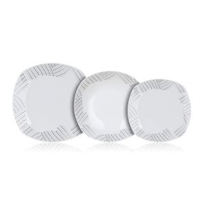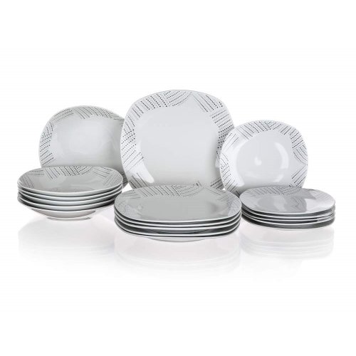 18dielna tanierová sada square CHARME je vyrobená z porcelánu. Sada obsahuje 6x dezertný tanier (diagonála 20 cm, šírka 18,5 cm), 6x hlboký tanier (diagonála 23 cm, šírka 22 cm) a 6x plytký tanier (diagonála 27 cm, šírka 25 cm). Taniere je možné používať do mikrovlnnej rúry a umývať v umývačke riadu.