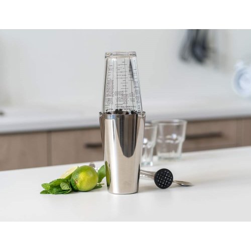 Nerezový šejker na koktaily AKCENT je vhodný na prípravu miešaných alkoholických i nealkoholických nápojov. Objem: nerezový diel 830 ml, sklenený diel: 450 ml. Výška: nerezový diel 16 cm, sklenený diel: 14,5 cm.