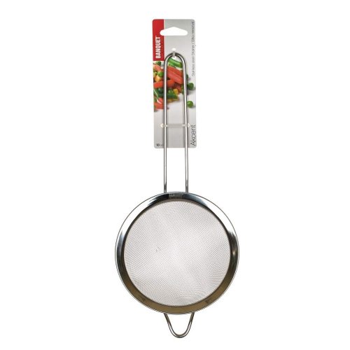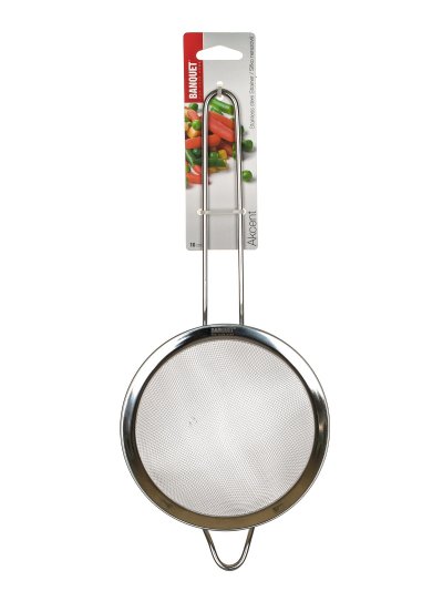 priemer: 10 cm dĺžka držadla: 13 cm držadlo so závesným očkom materiál: nerez 202 počet očiek: 20 na cm2 hrúbka siete: 0,28 mm materiál držadlá: kov
