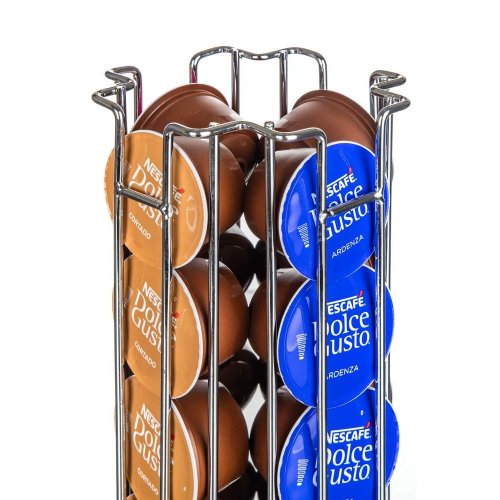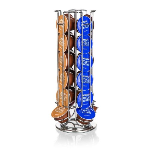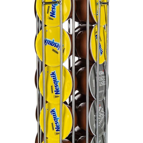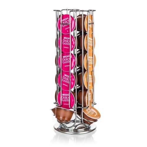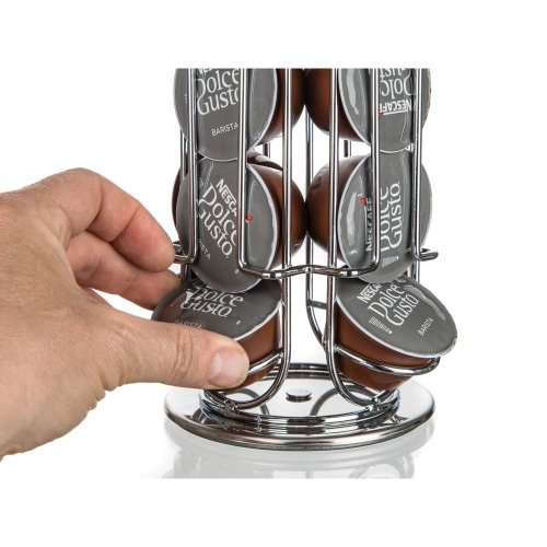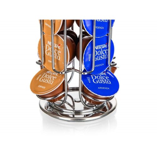 Stojan na kávové kapsule LINEA Dolce Gusto vyrobený z ocele, je šikovný pomocník na skladovanie kapsúl. Stojan je otočný a zmestí sa do neho až 24 ks Dolce Gusto kávových kapsúl. Kapsule sa dopĺňajú a odoberajú spodnou časťou stojanu. Rozmery: 13,5 x 13,5 x 32,5 cm.