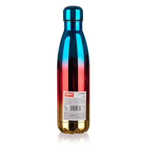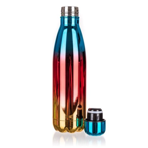 Termo fľaša FLAMENCO s objemom 500 ml má vonkajší aj vnútorný povrch z nerezu a plastové viečko. Vďaka dvojstennému prevedeniu si udrží nápoj dlhšie svoju teplotu. Termo fľaša je vo veľmi efektívnom, dúhovom, lesklom prevedení.