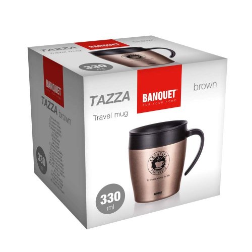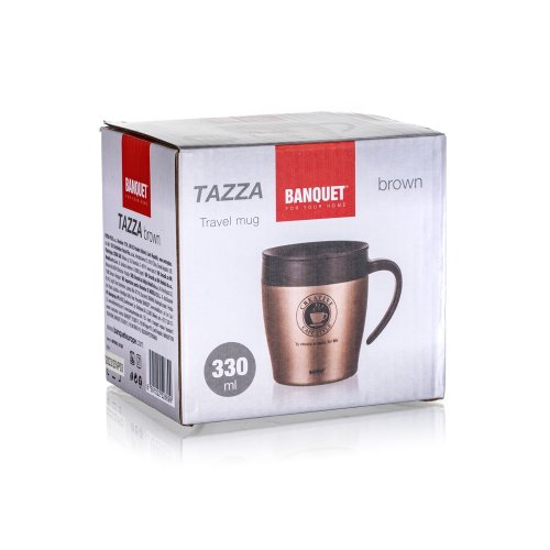 Dvojstenný cestovný termohrnček TAZZA v hnedej farbe, je vhodný na teplé aj studené nápoje. Vonkajšia časť je vyrobená z nerezu 201, vnútorná časť z nerezu 304 a viečko z plastu. Využiteľný objem je 330 ml. Telo hrnčeka je vákuové, udrží nápoje dlhšie horúce či studené. Viečko nie je nepriepustné, odporúčame uchovávať vo zvislej polohe.