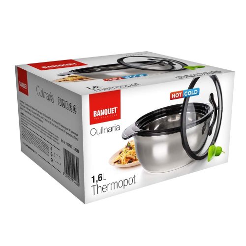 Termohrniec s pokrievkou CULINARIA 1,6 l je praktický na uchovávanie teplých pokrmov. Ocenia ho hlavne kuchári a kuchárky pri uskladnení hotových pokrmov pred samotným servírovaním. V nerezovom prevedení so sklenenou pokrievkou. Termohrniec sa vyrába v dvoch veľkostiach. Vnútro hrnca tvorí nerezová vložka, výplň medzi stenami je z PUR peny na zachovanie vynikajúcej izolácie pri skladovaní či prenášaní potravín.