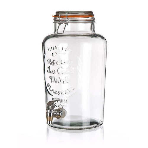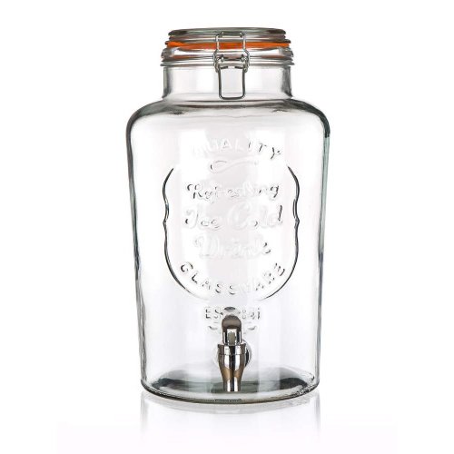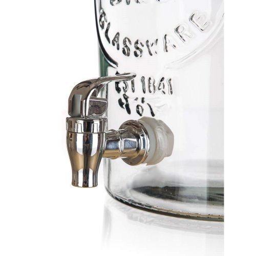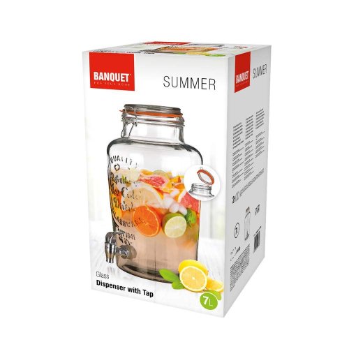 Sklenený zásobník na nápoje SUMMER s objemom 7 l slúži na servírovanie osviežujúcich nápojov na oslavách a letných párty. Zásobník je vyrobený z kvalitného číreho skla a je vybavený praktickým plastovým kohútikom na dávkovanie nápojov. Zásobník je určený na podávanie iba chladných a sviežich letných nápojov typu domáca limonáda, ovocný džús, ľadový čaj a podobne. Široké hrdlo umožňuje do nádoby pohodlne vkladať ľad alebo kúsky ovocia. Hĺbka výrobku je vrátane ventilu. V balení 2 ks tesnenia.