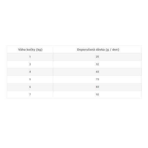 Jediný zdroj živočíšnych bielkovín – monoproteínová strava výrazne znižuje riziko vzniku intolerancií a potravinových alergií. Receptúra je pripravená s použitím čerstvého mäsa najvyššej kvality. Horčík pomáha znížiť pH v moči a obmedzuje tvorbu močových kameňov , zatiaľ čo juka pomáha znížiť zápach v stolici. Zinok, vitamín A a mastné kyseliny pomáhajú udržiavať kožu a srsť zdravú a lesklú. Prebiotiká (FOS) pridané do krmiva podporujú črevnú flóru zlepšujúcu trávenie a vstrebávanie živín.