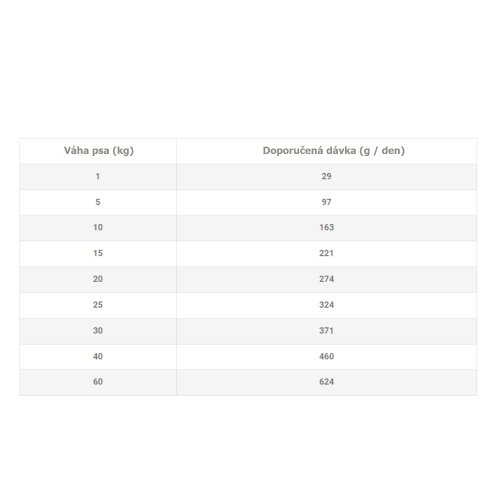 Analytické zložky: hrubý proteín 28%, hrubý tuk 17%, omega 3 mastné kyseliny 0,50%, omega 6 mastné kyseliny 3%, hrubá vláknina 3,50%, hrubý popol 7%, vápnik 1,40%, fosfor 0, 95%.