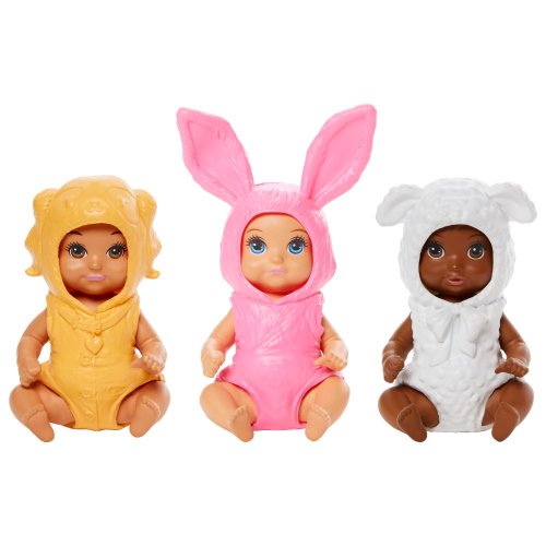 Tieto roztomilé bábiky Barbie® prichádzajú oblečené v odnímateľnom zvieracom kostýme, vďaka ktorému je každá ešte roztomilejší! Bábiky tiež nosia odnímateľnou plienku. Kostýmy zahŕňajú ružového zajačika, žltého šteňaťa a bieleho jahňacieho.