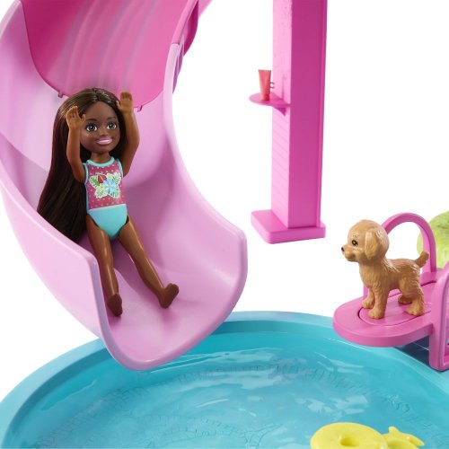 Vitajte pri Barbie bazéne snov! Tu je každý deň ten najlepší na kúpanie! Herný set ponúka šesť hracích zón, vrátane bazéna, šmykľavky, vírivky a snack baru, a viac ako 20 doplnkov. Naplň bazén vodou a usporiadaj poriadnu párty! Bábiky Barbie (predávajú sa samostatne) môžu kĺzať po šmykľavke do vody, páčkou spustíš bublinky vo vírivke a pri snack bare naservíruješ ďalšiu zábavu. Farby a vzhľad výrobku sa môžu líšiť.
