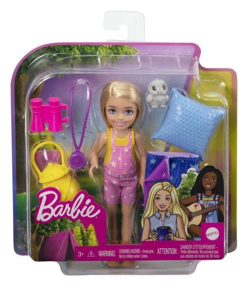 S herným setom Kempujúci Chelsea váš čaká plno zábavy pri kempovaní inšpirovanej úplne novým radom Barbie®! S bábikou Chelsea™ a jej rozkošnou kamarátkou sovou môže vaša fantázia prežívať toľko dobrodružstiev v prírode – kamaráti môžu stráviť deň prieskumom divočiny s kompasom a ďalekohľadom. Keď je čas ísť spať, môžu deti uložiť bábiku Chelsea™ do jej spacieho vaku s hviezdami a užiť si pohodlie s lampášom a vankúšikom.