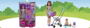Zahrajte si hru na stráženie detí s bábikou Skipper™, bábikou bábätka a tematickými doplnkami. Tento herný set obsahuje kočík, ktorý pri tlačení poskakuje hore a dole! Korbička sa dá z podstavy kočíka odňať na pohodlné prenášanie bábätka. Realistickú hru inšpirujú doplnky vrátane detskej dečky, hrkálky, fľaštičky a medvedíka. Bábika Skipper™ má na sebe letné šaty s kvietkami a fialové topánky a bábätko látkovú plienku. Bábika nevie samostatne štát. Farby a vzhľad výrobku sa môžu líšiť.