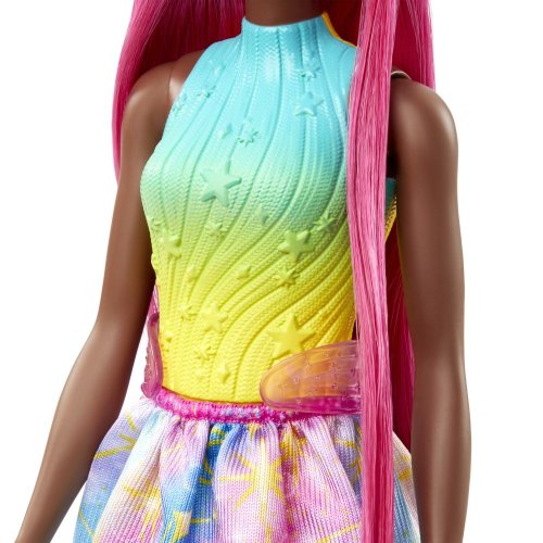 Táto rozprávková bábika Barbie® má extra dlhé a farebné vlasy v purpurovej farbe! Deti si môžu svoju jednorožčiu bábiku upraviť pomocou priložených vlasových doplnkov, potom ich znovu rozčesať a opakovane sa s nimi hrať do nekonečna. Rozprávkové prvky, ako sú roh jednorožca a čelenka s ušami, dodávajú tejto bábike Barbie® mimoriadny šmrnc. Bábika nevie samostatne štát. Farby a vzhľad výrobku sa môžu líšiť.