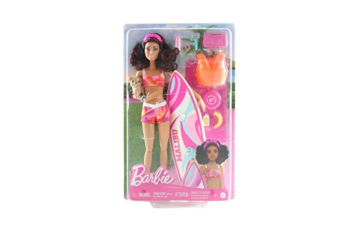 Hor sa do surfovania! S touto bábikou Barbie® sa deti môžu zahrať na dokonalý deň na pláži. Súčasťou balenia je surfovacia doska, šteniatko a tematické doplnky. Surfovacia doska s groovou potlačou drží bábiku na mieste pomocou klipov na nohy a remienka na členok, zatiaľ čo ona sa preháňa na vlnách. Bábika Barbie® má na sebe športový plavecký obleček s čelenkou a je dodávaná s hravým šteniatkom. Je poriadne natešená na zábavu na slnku a má polohovateľné telo, ktoré umožňuje realistický pohyb! Medzi ďalšie doplnky patrí záchranná vesta, uterák, stereo, frisbee, slnečné okuliare, fľaša s vodou, opaľovací krém, banán a ďalšie. Bábika nevie samostatne štát. Farby a vzhľad výrobku sa môžu líšiť.