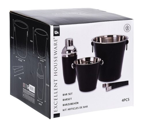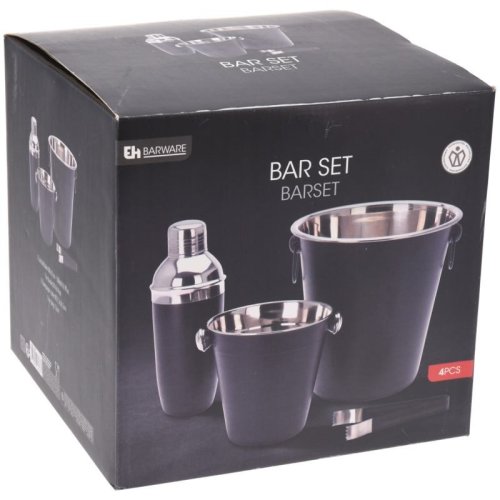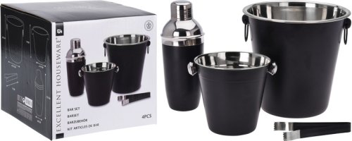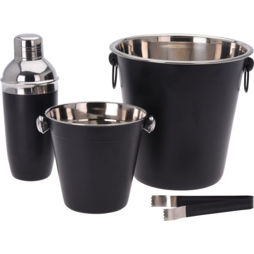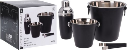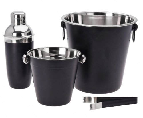 • kompletný barmanský set v atraktívnom čierno / nerezovom prevedení - materiál: nerezová oceľ - matný čierny povrch, nerezové vnútorné časti - kvalitné prevedenie, dlhá životnosť - vhodné do umývačky riadu, pre zachovanie dlhotrvajúceho dokonalého vzhľadu sa však odporúča ručné umývanie - kompletná sada 4 ks obsahuje :- 1x shaker na koktaily s viečkom a sitkom: objem 0.5 l / výška 22.5 cm- 1x kýblik na ľad: horný priemer 14 x výška 14 cm- 1x kýblik na víno, sekt či šampanské: horný priemer 20 x výška 21.5 cm- kliešte na ľad 12 cm