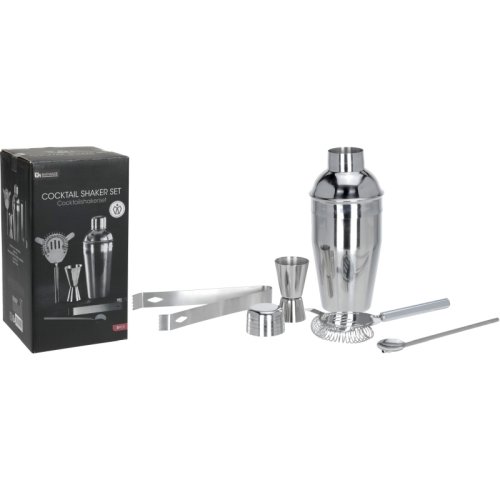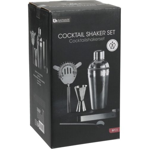 • kompletný barmanský set v nerezovom prevedení - materiál: nerezová oceľ - kvalitné prevedenie, dlhá životnosť - jednoduchá údržba, vhodné do umývačky riadu - kompletná sada 5 ks obsahuje: - 1x shaker na koktaily s viečkom: objem 0.5 l / výška 22 cm - 1x sitko pre cedenie priamo zo shakeru - 1x obojstranná odmerka 8,5 x 5 cm - 1x kliešte na ľad či ovocie 16,5 cm