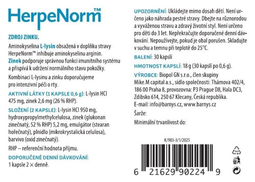 Aminokyselina L-lyzín obsiahnutá v doplnku stravy HerpeNorm™ inhibuje aminokyselinu arginín. Pokiaľ sa s diskomfortom stretávate častejšie, mali by ste sa vyhýbať potravinám bohatým na arginín (napr. orechy) a obmedziť príjem potravín s obsahom bielej múky, ryže, ďalej polotovarov a potravín s vysokým obsahom cukru.