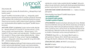 HypnoX® DuoMAX je silná kombinácia bylín (valeriány, chmeľu, mučenky a medovky) a bioaktívneho αS1-dekapeptidu Lactium®, ktorých duálne pôsobenie napomáha pri ťažkostiach so zaspávaním a prispieva k lepšiemu komfortu zaspávania ak zdravému spánku. Unikátna zmes je obohatená o vitamín B6 pre správnu činnosť nervovej sústavy, a prispieva tak k celkovej relaxácii organizmu v priebehu noci.