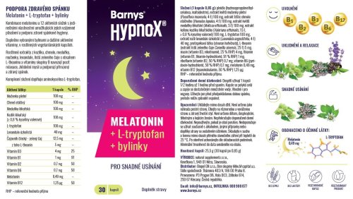 Zloženie (1 kapsula 0,85 g): plnidlo (hydroxypropylmetylcelulóza, maltodextrín), extrakt kvetov mučenky pletný (Passiflora incarnata, 4:1) 100 mg, extrakt šištičiek chmeľu otáčavého (Humulus lupulus, 4:1 u 5:1) 100 mg, extrakt koreňa valeriány lekárskej (Valeriana officinalis, 15:1, ≥ 0,8 % kyseliny valerovej) 100 mg, L-tryptofán 100 mg, extrakt vňate levandule úzkolistej (Lavandula angustifolia, 4:1) trakt listov zeleného čaju Camellia sinensis, 25:1) 5 mg, niacín (vitamín B3, nikotínamid, 25 % RHP*) 4 mg, tiamín (vitamín B1, tiamín-hydrochlorid, 91 % RHP*) 1 mg, riboflavín (vitamín B2, 50 % RHP*) 0,7 mg, vitamín B6 (pyridoxín-hydrochlorid, 50 % RHP*) 0,7 mg, melatonín 0,49 mg, vitamín B12 (kyano 5)