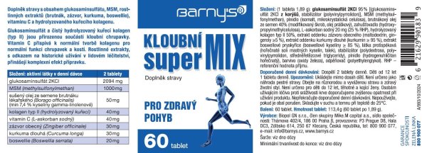 Zloženie : (1 tableta 1,89 g): glukosamínsulfát 2KCl 95% [(glukosamínsulfát 2KCl z kôrovcov, stabilizátor (polyvinylpyrrolidon)], MSM (metylsulfónylmetán), sladidlo (izomul) (modifikovaný škrob, olej práškový), zahusťovadlo (hydroxypropylmetylcelulóza), L-askorban sodný 20 mg (25 % RHP*), hydrolyzovaný kolagén typ II 50 %, extrakt podzemku zázvoru obyčajného (maltodextrín, gingeroly ≥5 %), extra %), extrakt boswellovej živice (boswellovej kyseliny ≥ 85 %), látka protispekavá (horečnaté soli mastných kyselín, taliek), stabilizátor (polydextróza, polyvinylpyrrolidon), plnidlo (hydrogénuhličitan horečnatý), farbivo (oxidy želez odpeňovač (polyetylénglykol).