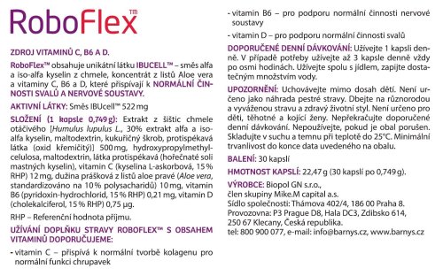 Barny's je autorom kĺbových produktov, ktoré patria medzi najrešpektovanejšie. Keď však človeka trápi chrbát a chrbtové svalstvo, nie sú produkty na kĺby dostatočne účinné. Preto vyvinuli doplnok stravy RoboFlex™, s unikátnou látkou IBUcell™ zahŕňajúcou chmeľ, aloe, vitamíny C, B6 a D.