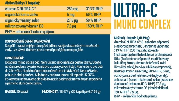 Výživový doplnok ULTRA-C IMUNO COMPLEX obsahuje kombináciu vitamínov C a D v bioaktívnej forme. Ďalej obsahuje organické formy minerálov (zinok, selén) v dostatočnom množstve na podporu a posilnenie imunity.