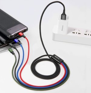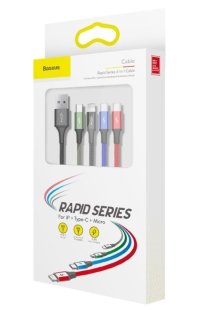 Baseus 4v1 nabíjací kábel určený pre zariadenia s USB-C, Lightning a MicroUSB zariadenia. Navyše tu nájdete dve koncovky Lightning na maximálne využitie všetkých vašich zariadení na maximum. Nabíjajte až 4 zariadenia naraz.
