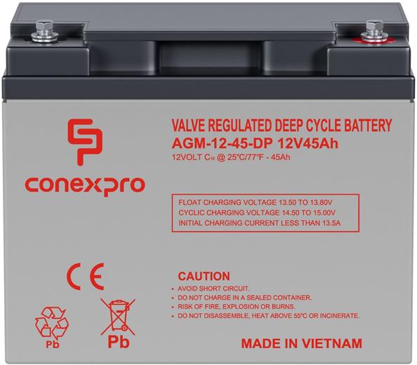 Batéria Conexpro AGM-12-45-DP poskytuje stabilné napájanie pre menšie zariadenia s cyklickou prevádzkou , ako sú solárne systémy, karavany, záložné zdroje UPS, bezpečnostné technológie alebo IT infraštruktúra. Vďaka technológii Absorbent Glass Mat (AGM) je elektrolyt bezpečne viazaný v poréznej štruktúre zo sklených vlákien, čo zaisťuje vysokú odolnosť voči opakovanému vybíjaniu a bezproblémovú prevádzku bez nutnosti údržby. Batéria je vybavená M6 konektormi pre jednoduché a bezpečné pripojenie. Nízke samovybíjanie zaisťuje pripravenosť na použitie aj po dlhšej dobe nečinnosti.