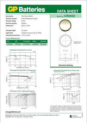 možnosť nabíjania: nie chemické zloženie: lítiové napätie: 3 V kategórie/rad: Lítium menovitá kapacita: 220 mAh (pri záťaži 15 kOhm) typové označenie: GP CR2032 rozmer: 20,0 × 3,20 mm