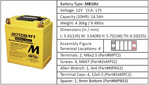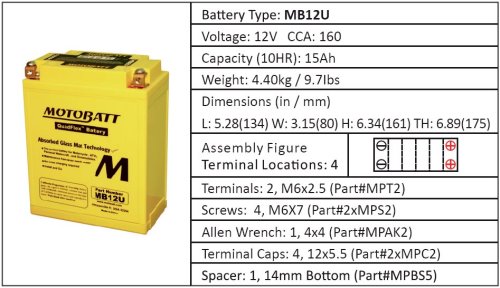 Motobatérie Motobatt MB12U 15 Ah slúži ako náhrada batérií: 12N12-4A, 12N12A-4A-1, CB12A-A, CB12A-AS, CB12A-AWS, CB12AL-A, CB12AL-A2, CB12A.