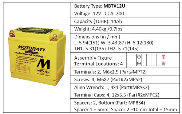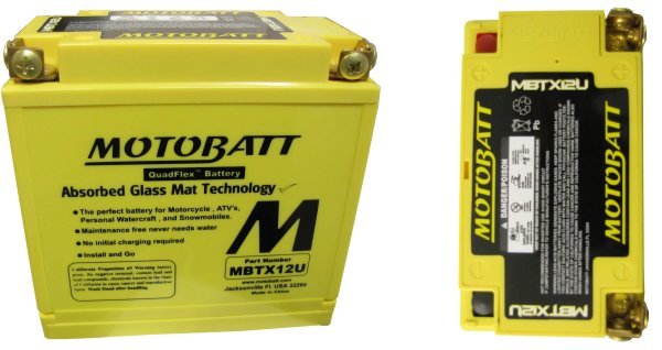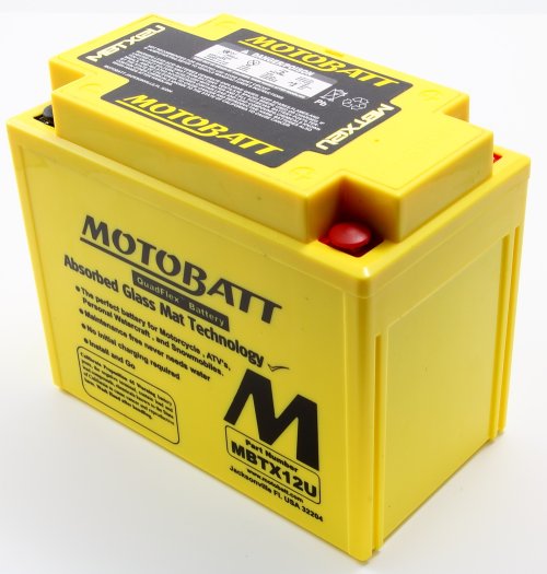 Motobatérie Motobatt MBTX12U náhrada batérií: YTX12BS, YTX14HBS, YTX14BS, YTX14LBS s vyššou kapacitou oproti konkurenčným akumulátorom, pri zachovaní veľkosti a AGM technológií (elektrolyt napustený v sklenom rúne) umožňuje variabilné umiestnenie batérie , tzn. môže byť naklonená, alebo aj ležať.