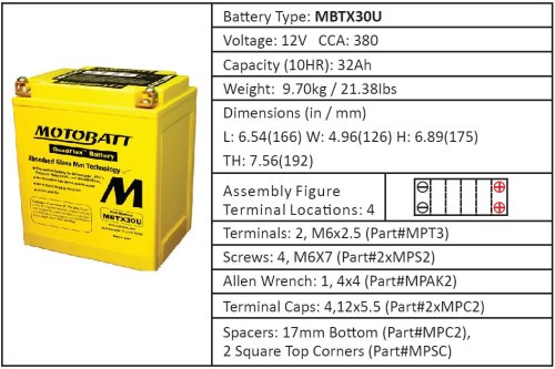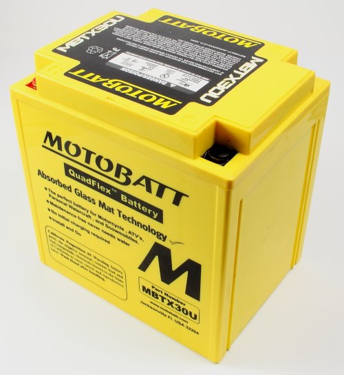 Motobatéria MOTOBATT MBTX30U 34Ah náhrada batérií: 12N18-3, 12N18-3A, Y50N18AA, Y50N18LA, Y50N18LA-2, Y50N18LA-3, Y50N18LACX, SY50N18 MBTX24U s vyššou kapacitou oproti konkurenčným akumulátorom, pri zachovaní veľkosti a AGM technológiou (elektrolyt napustený v sklenom rúne) umožňuje variabilné umiestnenie batérie , tzn. môže byť naklonená, alebo aj ležať.