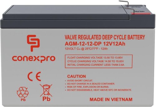 Olovená AGM Deep Cycle batéria Conexpro 12V/12Ah je spoľahlivým zdrojom energie so životnosťou až 10–12 rokov . Vďaka konštrukcii typu Deep cycle zvláda opakované hlboké vybíjanie a nabíjanie, čo z nej robí ideálnu voľbu pre solárne systémy, karavany, lode, UPS záložné zdroje aj bezpečnostné a IT technológie.
