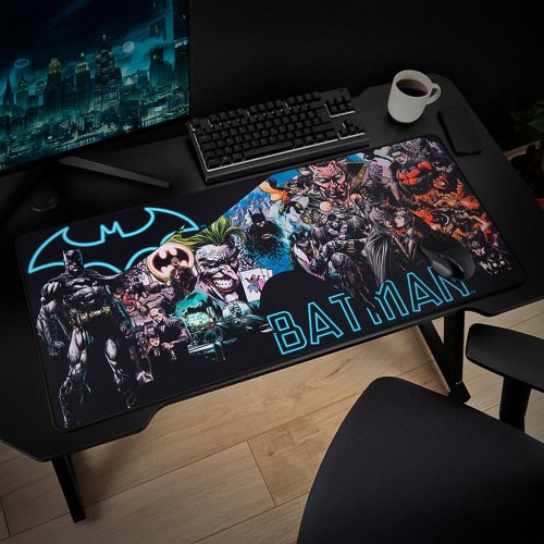 Veľká podložka pod myš a klávesnicu pre fanúšikov populárneho superhrdinu z komiksu, Batmana. Vysoko kvalitná tlač odolná proti vode zaručuje dlhú životnosť a ochranu proti škvrnám a opotrebovaniu. S priľnavým gumovým podkladom je podložka bezpečne prichytená k stolu, kde zostáva za všetkých okolností.