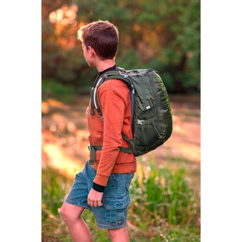 VÝHODY:, * chrbtový systém zaručujúci zdravé nosenie, * mäkko polstrovaný a vystužený chrbát s ventiláciou vzduchu pre zdravé nosenie, * ergonomicky tvarované ramenné popruhy s krčným prekrojením, * ergonomický bedrový pás, * stabilizačný hrudný popruh, * optimálne zvolený objem a jeho členenie zips, * predné 3D vrecko na zips, * vnútorný tunel na stabilizáciu fľaše, * bočné vrecká zo sieťoviny, * rad kompresných popruhov a prvkov pre fixáciu výstroja, * bezpečnostné reflexné body - reflexné vtáky na batohu a ďalšie reflexné prvky na popruhoch, * na vonkajšom materiáli je použitá WR 140 cm do 160 cm.,