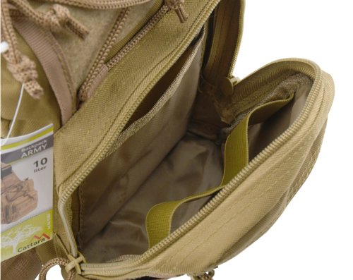 Batoh Cattara ARMY 10 l je skvelou voľbou na uloženie všetkého vybavenia, ktoré je potrebné na cesty. Tento objemný polstrovaný plecniak na rameno zo 100% polyesteru s vodeodolnou PVC vrstvou z vnútornej strany je opatrený 1 hlavnou, 2 vedľajšími, 3 vnútornými vreckami a 1 zadným priedušným vreckom . Z čelnej strany a na bokoch nájdete Molle systém na uchytenie ďalšieho vybavenia . Vrecká sú osadené pevným 2-cestným zipsom . Vnútorné vrecká a sieťové vrecko sú doplnené o pútka na bezpečné nosenie drobných predmetov.