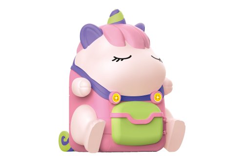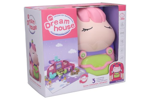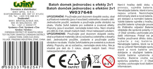 Batoh domček jednorožec 2v1. Rozmery plecniaka 18x16x26 cm. Svetelné a zvukové efekty. 3xAA batérie nie sú súčasťou. Domček obsahuje spálňu, obývačku, kúpeľňu, kuchyňu s jedálňou, záhradku. Súčasťou 2 figúrky, nábytok, kvetináče, náradie na záhradu, oplotenie. Obrázkový návod na zloženie na spodnej strane obalu.