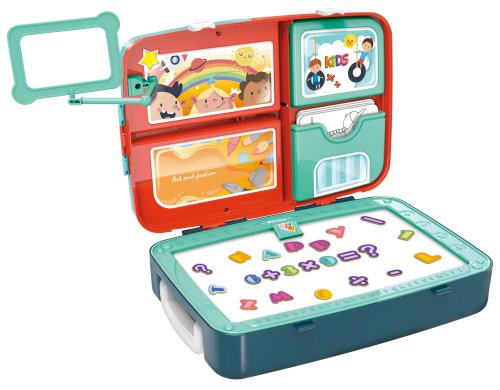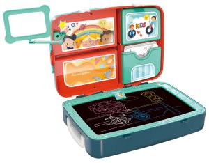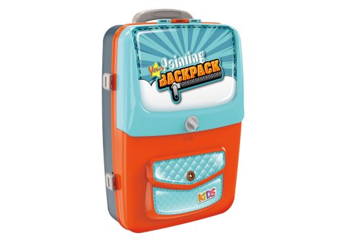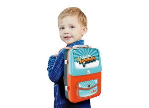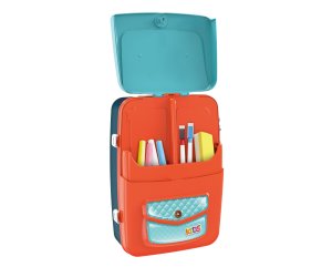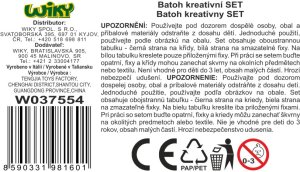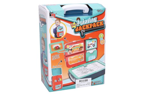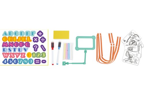 Batoh kreatívny. Veľkosť 28cm. Otvárací batoh, obsahuje otvárateľné priehradky, kresliacu tabuľku na mazacie fixky a prichytenie magnetiek, druhú stranu tabuľky možno popísať kriedou, magnetické čísla a písmenká, kriedy, hubku na mazanie, mazacie fixky, popruhy na chrbát, nálepky na ozdobenie.