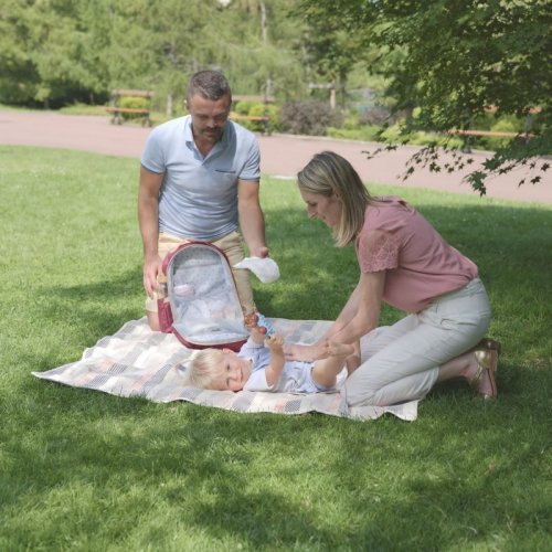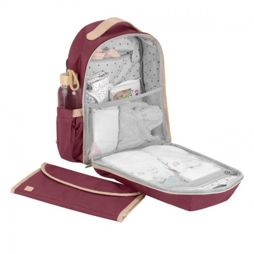 • zvonku 1 bočné vrecko na fľašu a veľké izolované vrecko na fľaše či detskú výživu prístupné cez prednú časť batohu