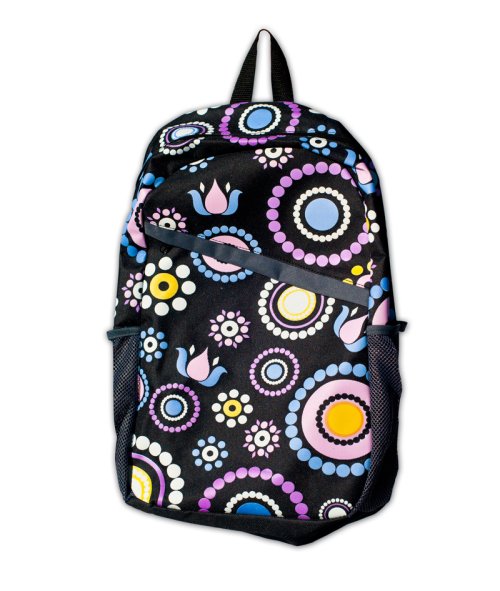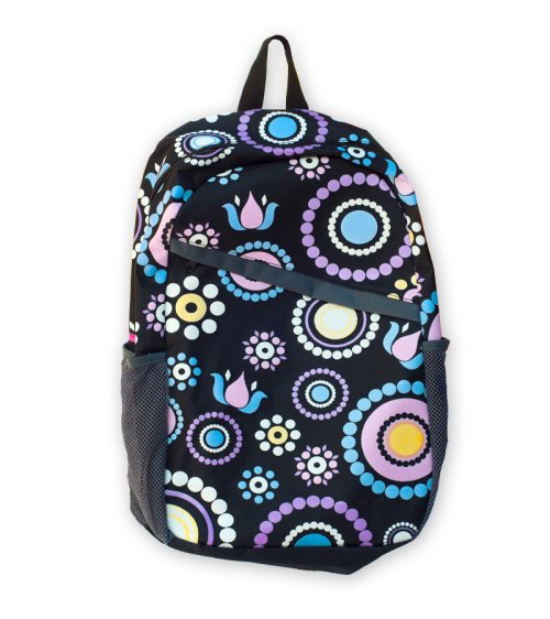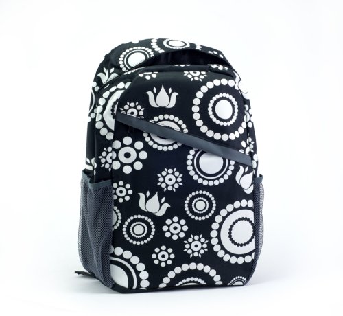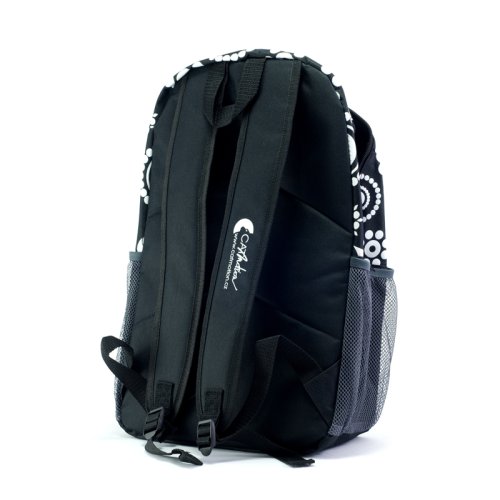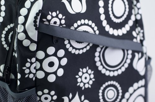 Batoh je z pevnej umelej tkaniny s čiernymi nastaviteľnými popruhmi. Farbu má čiernu a je potlačený bielymi ornamentmi, ktoré na slnku mení farbu na fialovú, ružovú, modrú, žltú a oranžovú. Vo vnútri má veľký priestor s oddelenou vreckom na dokumenty, tabliet či malý notebook. Na prednej strane je malá hlboká vrecko na zips. Z oboch bočných strán má batoh malé sieťové vrecká na drobnosti či fľaše.