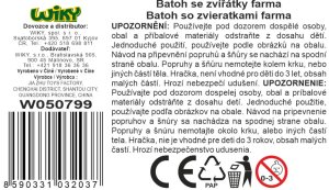 Batoh so zvieratkami farma. Rozmery 27x17x19 cm. Súčasťou zvieratka, stromy a ďalšie, hracia mapa, popruh na chrbát, šnúra s popruhmi (možno batoh ťahať), rukoväť v hornej časti batohu. Návod na inštaláciu popruhov a šnúry na spodnej časti obalu.