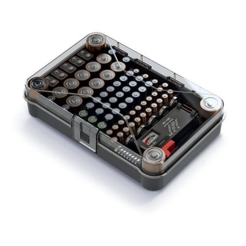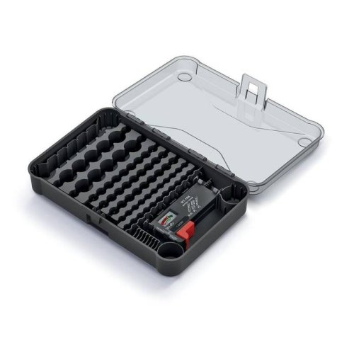 moderný organizér boxu na batérie s testerom batérií 85 slotov na batérie priehľadný kryt z odolného polykarbonátu vyberateľný tester batérií telo z vysoko odolnej polymérovej zmesi možnosť montáže na stenu