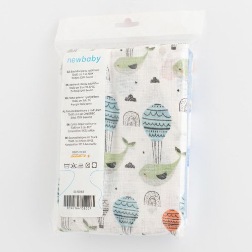 Bavlnené detské plienky českej značky New Baby vo zvýhodnenej sade, sú nepostrádateľnou súčasťou výbavičky pre bábätko. Balenie obsahuje 3 ks. Dve plienky s obrázkami a jedna jednofarebná. Vhodne zvolené farby a obrázky pre chlapčekov. Plienky sú vyrobené zo 100% bavlny. Sú hygienické, nespôsobujú alergickú reakciu a napomáhajú zdravému vývoju bedrových kĺbov u novorodencov. Môžete ich využívať nielen na prebaľovanie ale aj pod hlavičku bábätka v postieľke či kočíku. Vysoká kvalita spracovania.<BR>Charakteristika:<BR>Rozmery plienky: cca 70x80 cm<BR>Materiál: 100% bavlna<BR>Gramáž materiálu: 120g/m2<BR>Certifikát: OEKO-TEX STANDARD 100