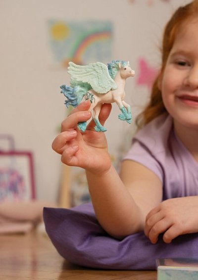 Žriebä jednorožca Stormy roztiahne svoje veľké svetlomodré krídla a natiahne ich do vetra. To pravé počasie pre temperamentný žriebä! Keď jeho trblietavá hriva veje v protivetre a búrka zmieta jeho modrý až tyrkysový chvost zo strany na stranu, je naozaj vo svojom živle. Žriebä Stormy búrka úplne miluje. Žriebä jednorožca rado propaguje udržateľnú veternú energiu. Rozmery balenia: 9 x 9,7 x 3 cm. Vek: 5+
