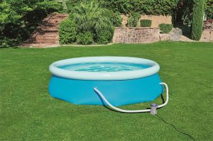 Bestway® Kruhový bazén Ø 305 x 76 cm s kartušovou filtráciou z kolekcie bazénov Fast Set. Rýchla a jednoduchá montáž - stačí si vybrať rovnú plochu, nafúknuť horný prstenec, napustiť bazén vodou a behom chvíľky sa budete kúpať. Sada obsahuje filtračné čerpadlo a filtračnú vložku, ktorá udržuje vodu čerstvú a čistú. Dodáva sa tiež s vypúšťacím ventilom na reguláciu prietoku, ktorý umožňuje rýchle vypustenie na konci sezóny. Pre Bestway Fast Set Pool nie sú potrebné žiadne náradie. Tieto bazény sa ľahko zostavujú a konštruujú z odolných materiálov a zaisťujú, že letná zábava bude trvať celú sezónu. TRITECH® Bazénová vložka z robustného, 3-vrstvového materiálu. Tento 3-vrstvový pevný materiál kombinuje PVC a sieťovinu a vytvára odolný materiál, ktorý je vystužený pre pevnosť a odolnosť proti prepichnutiu. Jednoduché zostavenie - jednoducho vybaľte, postavte, nafúknite a naplňte. Obsah sady: 1 bazén, 1 filtračné čerpadlo (220-240 V) s kompatibilnou kazetou, 1 záplata na opravu pod hladinou vody. Rozmery bazéna: Ø 305 x 76 cm. Maximálna kapacita vody (80 %): 3800 litrov. Použitie pre deti vždy pod dozorom dospelej osoby. Rozmery balenia: 31 x 47 x 29 cm.
