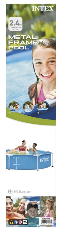Bazénový set o veľkosti 2,44 mx 51 cm, Objem vody (90% výšky bazénovej steny) je 1828 litrov. Bazén je naplnený do 30 minút.