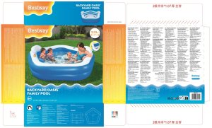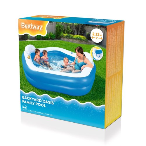 Bazén Backyard Oasis ™ je nafukovací rodinný bazén určený pre deti od šiestich rokov. Jeho konštrukcia je vyrobená z odolného PVC materiálu, ktorý zaisťuje dlhú životnosť a bezpečné používanie. Bazén má rozmery 213 cm na dĺžku, 206 cm na šírku a výšku 69 cm, čo poskytuje dostatok priestoru na pohodlné kúpanie viacerých osôb naraz. Dizajn bazéna je charakteristický modro-bielou farebnou kombináciou, ktorá pôsobí sviežo a príjemne zapadne do záhradného prostredia.