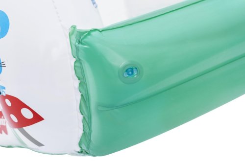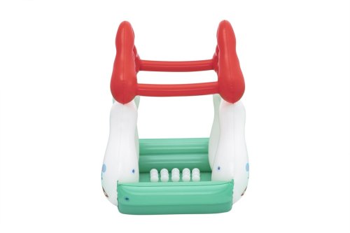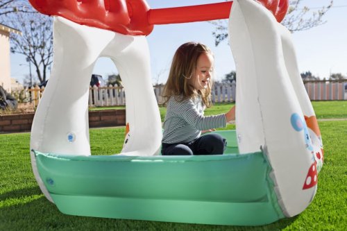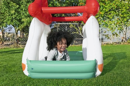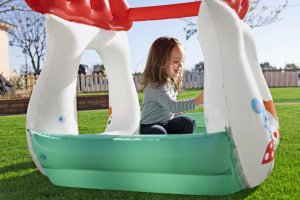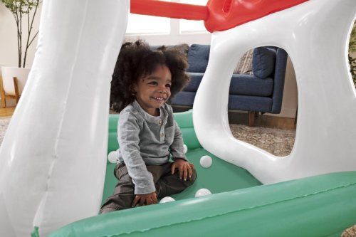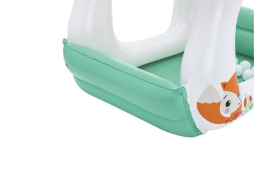 Bazén má nafukovacie mäkké steny a širokú základňu, ktorá zabraňuje jeho prevráteniu, čím zvyšuje bezpečnosť dieťaťa pri hraní. Konštrukcia je otvorená zo všetkých strán, čo umožňuje ľahký prístup dovnútra a zároveň ponúka dostatok priestoru na pohyb. Hornú časť tvoria dve nafukovacie červené strechy s otvormi, ktoré môžu slúžiť ako herný prvok, napríklad na vkladanie priložených loptičiek. Vnútri bazénika sa nachádza 15 bielych plastových loptičiek, ktoré rozvíjajú motoriku a zmyslové vnímanie dieťaťa. Bazénik je navyše vybavený opravnou záplatou pre prípadné menšie poškodenie.